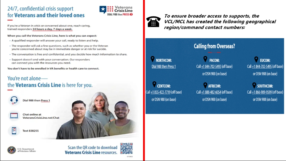 Service members, Veterans, and their families face unique challenges. Whether you’re stationed stateside or overseas, you’re never alone. The Veterans/Military Crisis Line (VCL/MCL) is a free, confidential resource available 24/7 to those in crisis or those concerned about someone else.